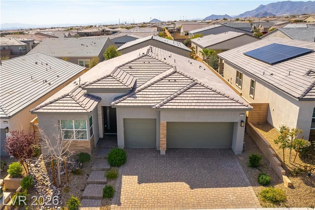 Gorgeous Toll Brothers single-story home in a gated community in Skye Canyon. Great room floorplan, 3 bedrooms & den, 2 bathrooms, 3 car garage. Ten-foot ceilings, plantation shutters, custom paint, raised panel doors. Living room area has ceiling fan & is open to the kitchen. Kitchen with custom cabinets with rollouts & 40uppers, quartz counters with full backsplash, island with breakfast bar, walk-in pantry, stainless steel KitchenAid appliances, 5 burner gas cooktop, built-in convection oven & microwave, dishwasher, & refrigerator. Den with double French doors & ceiling fan. Primary bedroom has ceiling fan, a barn door to the bath, walk-in closet, & is separate from the other bedrooms. Primary bath with double sinks & stall shower with seat. 2nd bedroom has ceiling fan & its own full bath. 3rd bedroom with ceiling fan. 24x12 tile & high-end carpet in the right places. Smart home switches & thermostats. Backyard with large covered patio & artificial grass lawn.
