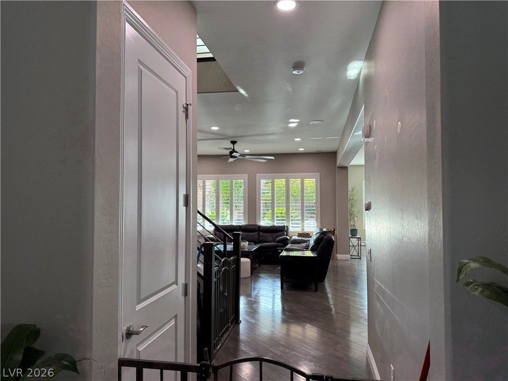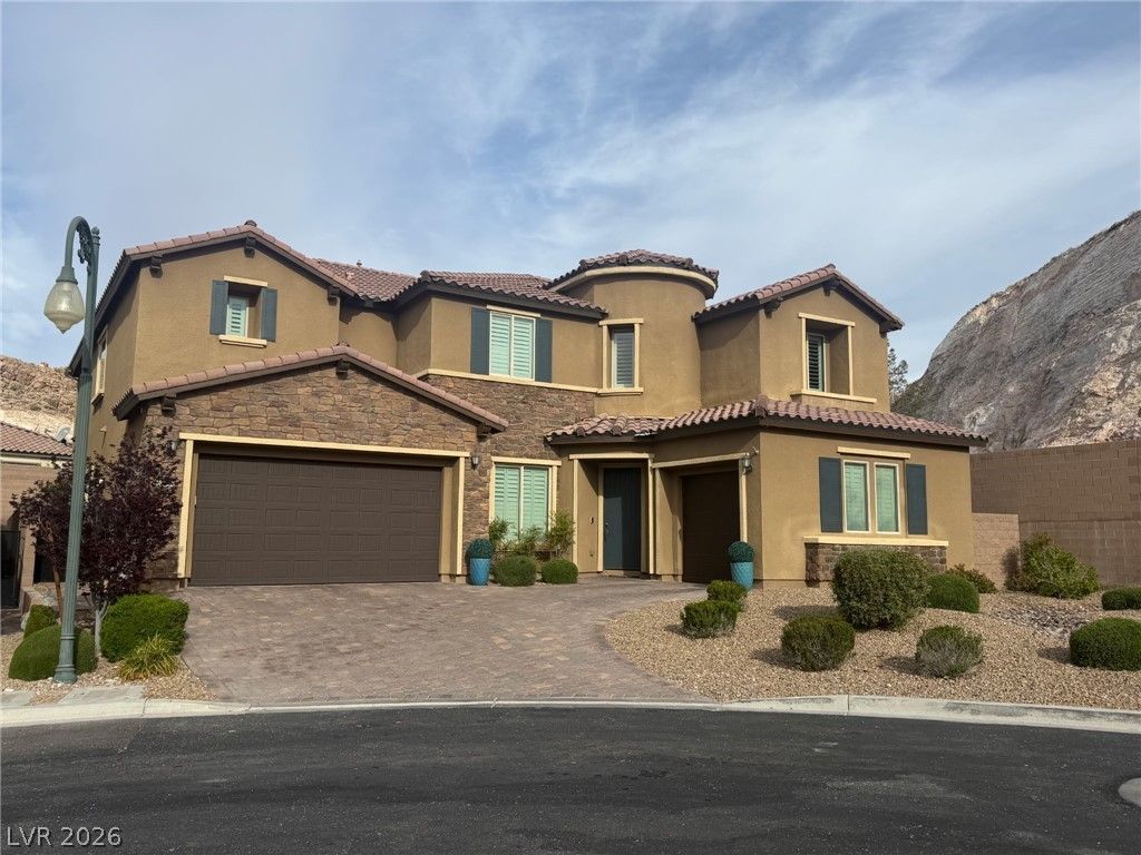 LUXUERY AT ITS BEST, NESTLED IN THE COVE AT SOUTHERN HIGHLANDS, This Next Gen home is on a cul-de-sac in a gated community adjacent to protected mountainside, this highly upgraded ~4,746 sq ft home offers exceptional indoor/outdoor living just minutes from I-15, the Strip, and airport. The resort-style backyard features a fully automated pool and spa with elevated water features, travertine decking, fire pit, and a covered outdoor kitchen with built-in grill, refrigerator, and wood-fired pizza oven. Inside, enjoy a recently renovated primary bath with spa-like finishes, an open great room with surround sound, custom built-ins, upgraded pantry and butler's area, and a downstairs suite with sitting area can be used as a second primary bedroom. Additional highlights include dual HVAC systems with 4 zones, whole-home wiring, plantation shutters, and fully finished garages with extensive storage. Move-in ready with extensive upgrades throughout.