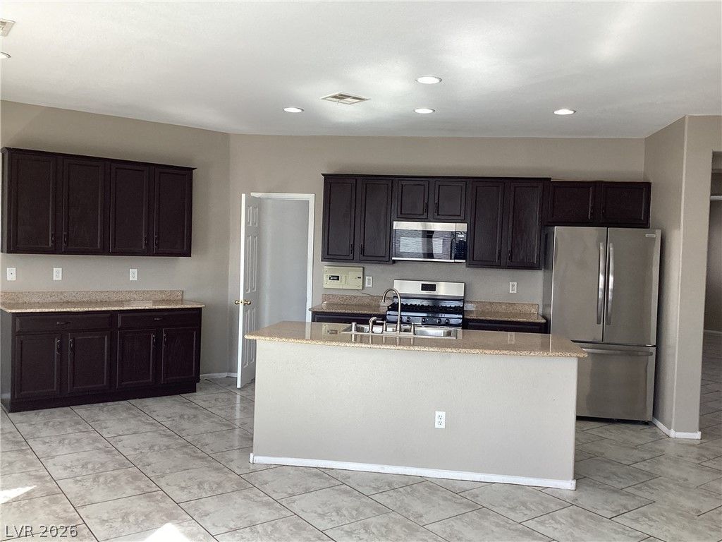 Welcome to this spacious 6-bedroom, 4.5-bath home located at the end of a quiet cul-de-sac in a desirable North Las Vegas neighborhood. This well-designed residence features two bedrooms and 1.5 baths downstairs, ideal for guests or multi-generational living. The home offers an open and functional layout with a large loft, separate living and family rooms, and both a formal dining area and kitchen nook. The chef's kitchen includes granite countertops, a breakfast bar, center island, and walk-in pantry. Tile and carpet flooring run throughout, with ceiling fans in every room for added comfort. The primary suite includes a private balcony for relaxation. Enjoy a large backyard with covered patio, perfect for entertaining, plus a 3-car garage providing ample parking and storage. Don't miss this incredible opportunity?tenant to verify all information.