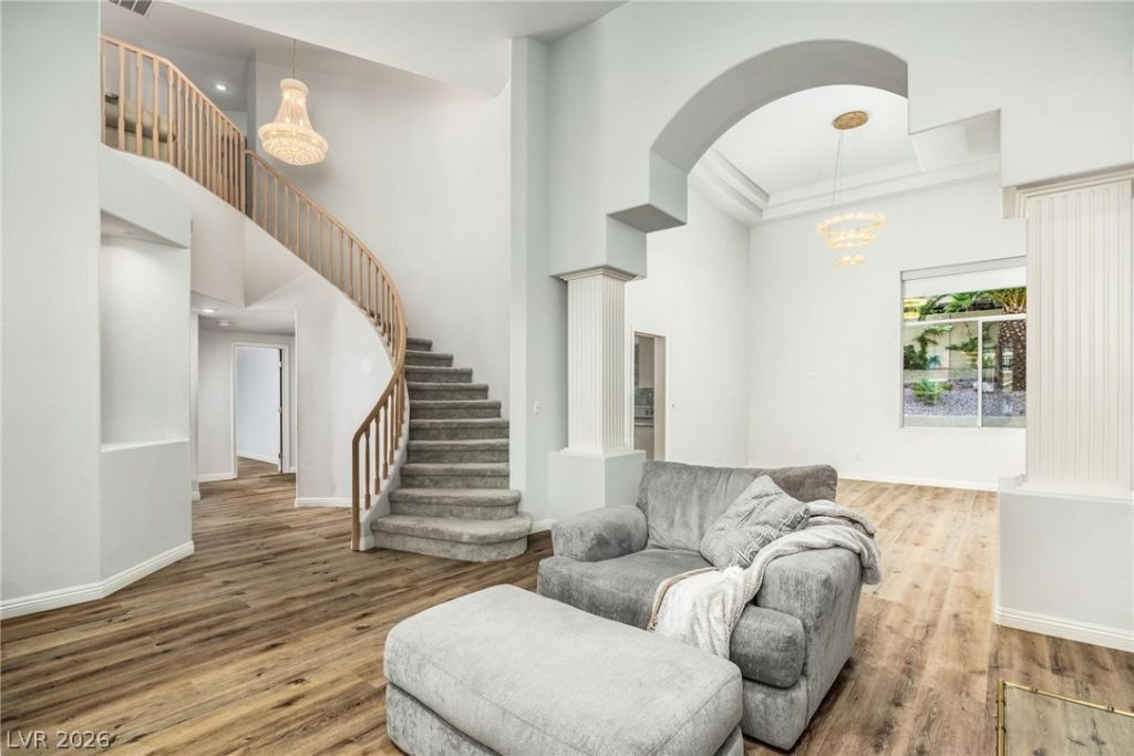 Stunning remodeled Summerlin home featuring new LVP flooring throughout the first floor, new kitchen backsplash, white shaker hardwood cabinets, soaring ceilings, and a dramatic curved staircase. The stunning backyard offers a saltwater gas heated pool/spa with new PebbleTec finish and pool tiles, a chip-n-putt green, and low maintenance mature landscaping. Additional property features include a new roof (less than three years ago), fully renovated owners suite bathroom, renovated secondary bathrooms featuring new Cambria quartz countertops with Moen faucets, recently replaced kitchen appliances, custom California designed closet in primary, water filtration system, new window coverings, and new irrigation system.