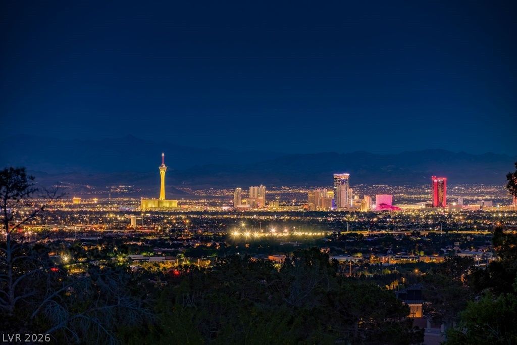 Commanding panoramic views of the Las Vegas Strip, Valley, and Eagle Crest Golf Course highlight this stately Westminster model, perched high in the newest section of Sun City Summerlin. Offering 2,934 sq. ft., this home features a 3-car garage, dual en-suites, office/den, and 1/2 bath. Stone-accented curb appeal and artificial turf create a welcoming exterior. Expansive rear windows capture breathtaking views from the living room and kitchen rotundas, primary suite, and kitchen/great room with fireplace. The spacious primary en-suite includes a fireplace, dual vanities, garden tub, separate shower, and large walk-in closet. Secondary en-suite offers privacy for guests. Upgrades include rolling shutters, hard surface flooring, plantation shutters, and ceiling fans. Extended covered patio showcases stunning sunrise and evening Strip views. Located in premier 55+ Sun City Summerlin with 3 golf courses, 4 clubhouses, fitness, sports courts, dining, entertainment & more.