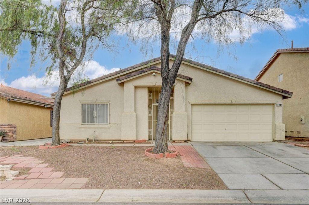 Charming 3 Bedroom, 2 Bath Single Story Home in Las Vegas. This move in ready single family residence offers comfortable living with plenty of natural light and neutral tones throughout. The open concept layout flows beautifully from the living area into the kitchen, which features light wood cabinetry, white appliances including a gas stove, a breakfast bar with sink, and plenty of counter space. The home includes three spacious bedrooms and two well maintained bathrooms. The primary bedroom includes its own en suite bathroom for added privacy. Outside you will find a covered patio ideal for relaxing or hosting gatherings, along with a private backyard enclosed by a block wall for privacy. The low maintenance desert landscaping makes upkeep easy. Additional features include a full size washer and dryer, a two car garage, tile and wood look flooring, and easy access to local amenities.