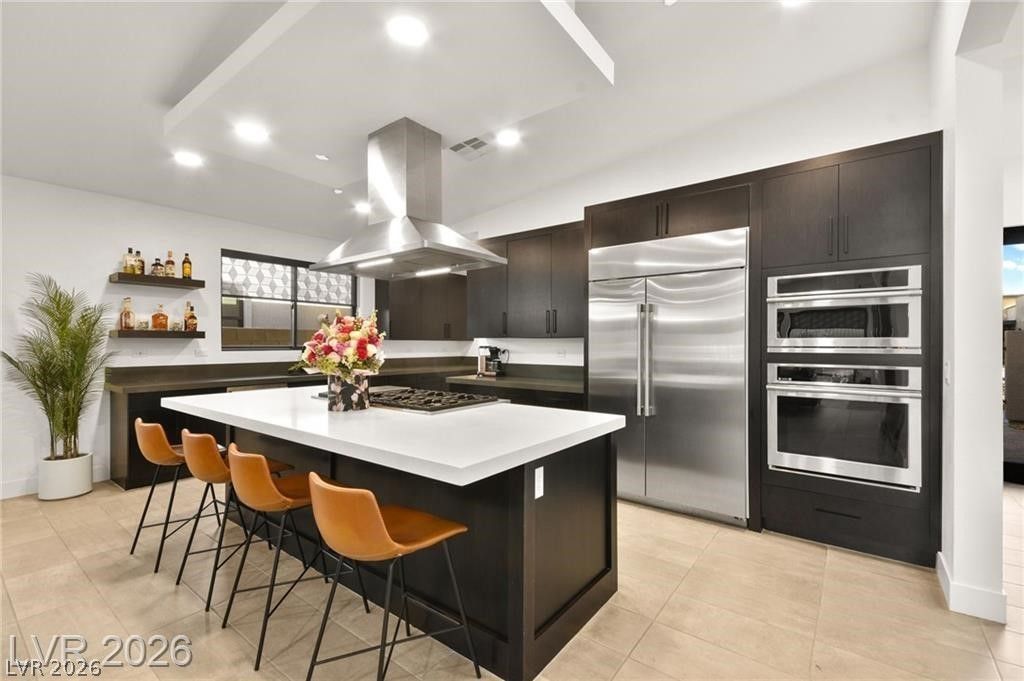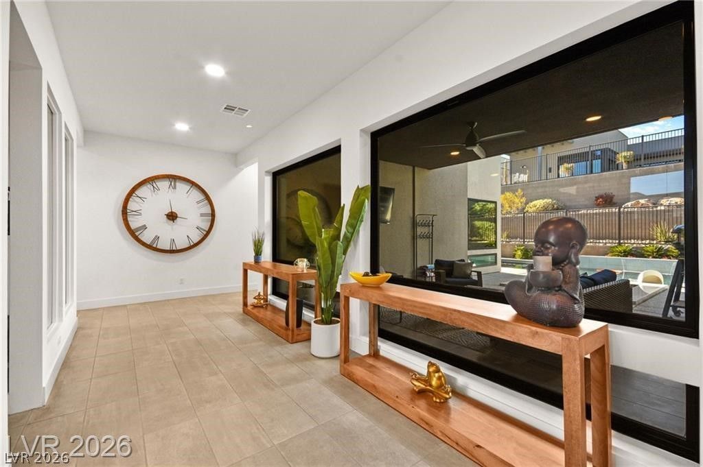 Immaculate 3-bedroom, 2.5-bath home in the sought-after master-planned community of Summerlin West, minutes from Red Rock Canyon, top-rated schools, parks, trails, and Downtown Summerlin shopping and dining. A striking pivot glass door opens to a private courtyard and a bright interior with soaring ceilings, concrete-style tile flooring, Andersen windows, and smart-home features. The great room features a 55 linear fireplace and triple-stacking glass doors leading to a covered loggia for indoor-outdoor living. The private backyard includes a pebble tech pool and spa with an in-floor cleaning system. The chef's kitchen offers upgraded countertops, custom cabinetry, and GE Monogram appliances. The primary suite features a spa-like bath with dual sinks, multi-head rain shower, and oversized walk-in closet. Additional highlights include a glass-enclosed office/den, 3-car garage with 240V EV charger, paid-off solar, whole-house water softener, and 7-stage reverse osmosis system.