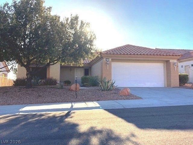 Adorable 2 bedroom 2 bath home in Sun City Summerlin. Tile flooring throughout and an extra room off the kitchen with serve-through. Newer stainless steep appliances in the kitchen with plenty of cabinet space. Primary bedroom has a private bath, 2 closets (1 walk-in), ceiling fan and additional storage. Washer and dryer supplied and extra freezer/ refrigerator located in garage storage room. Laundry room has its own separate space with sink. Garage with storage galore. Cabinets on both sides and a storage room. Mature landscaping in the front and rear yard with a fully fenced rear yard with a Mountain View. A lot to enjoy in this home and in the community. Sun City Summerlin features multiple clubs, social calendar, multiple pools and spa's, fitness centers, tennis, pickleball, golf, restaurants, entertainment and so much more!